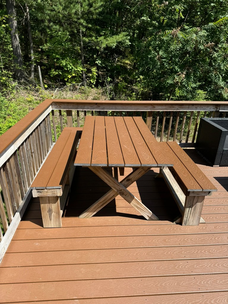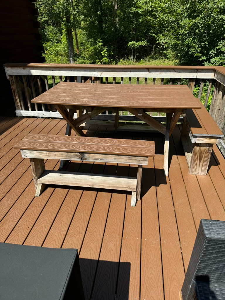 I used left-over wood and plastic decking to make a table and benches nestled into a corner spot