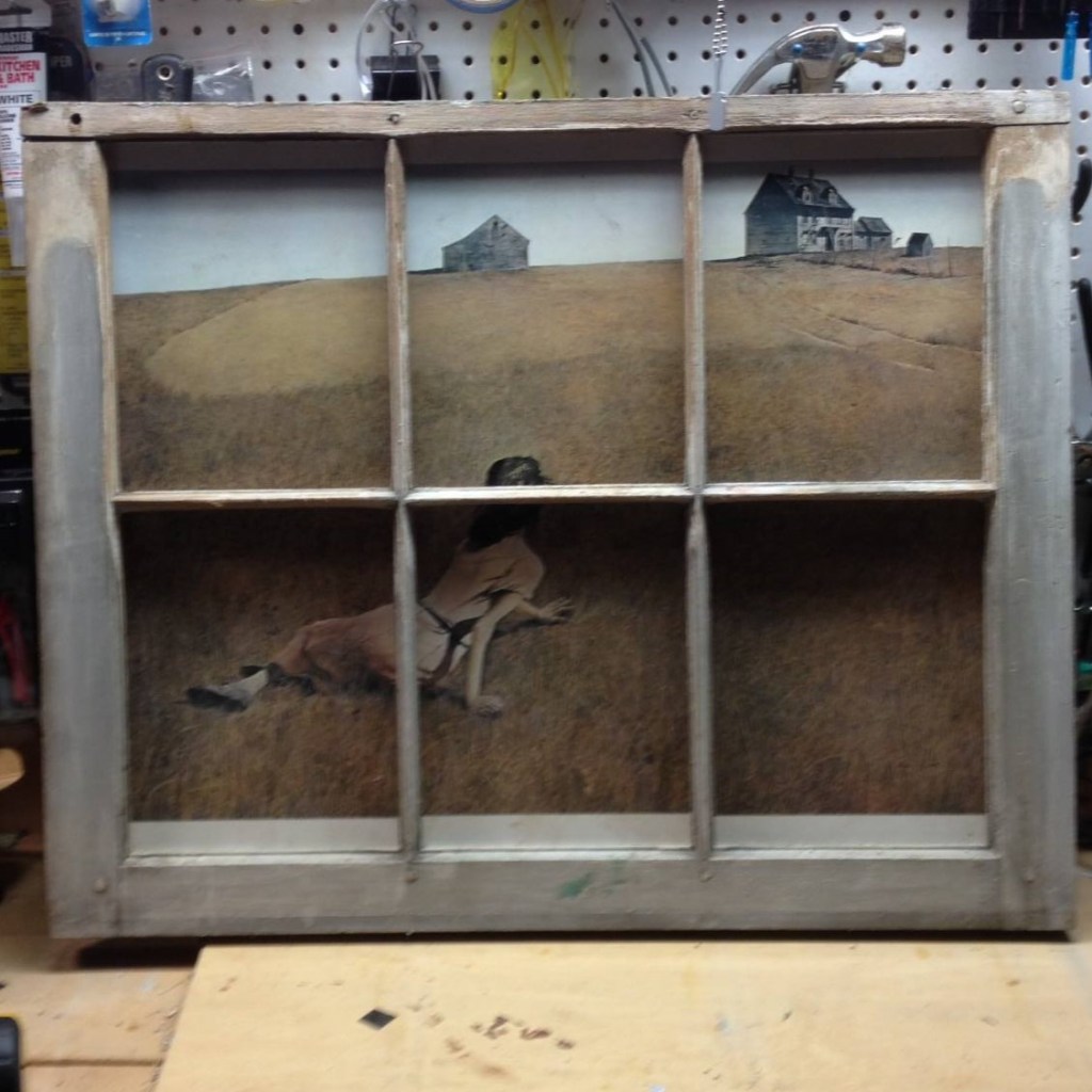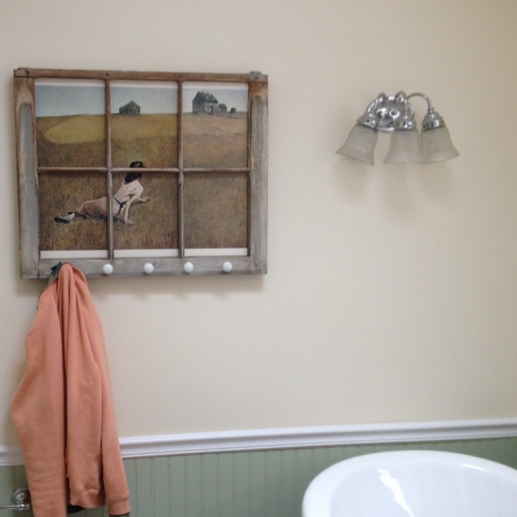 Made a place to hang your clothes from a Wyeth print, reclaimed window, and kitchen knobs…