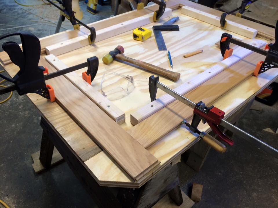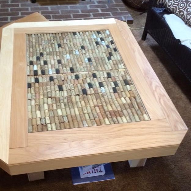 A fun coffee/puzzle table with corks under the glass… made from scrap wood flooring